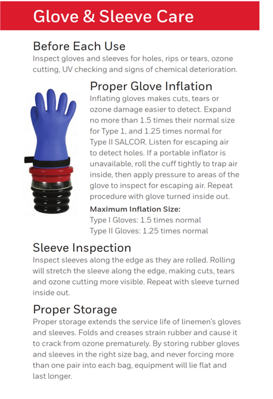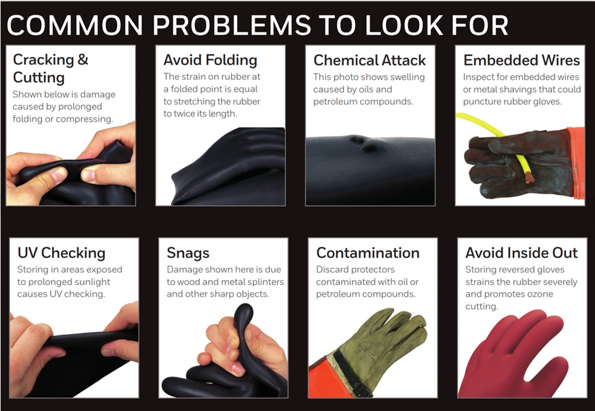 OSHA requires that protective equipment be maintained in safe, reliable condition. Gloves should be inspected for tears, holes ozone cuts and other defects before each use. For more information, refer to ASTM F 1236-19 standard guide for the visual inspection of electrical protective rubber products.
